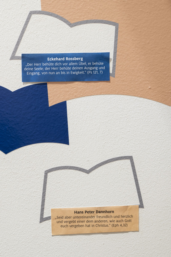 Im Herzen des Bibelmuseums, auf der gestalteten Treppenhauswand, können 60 Spender*innen mit einer Gabe von 1.000 € eine hochwertige Spendenplakette zu einem Fliegenden Blatt erwerben, das Sie eigens auswählen können. Die Spendenplakette wird mit Ihrem Namen und einer von Ihnen individuell ausgewählten Bibelstelle versehen.