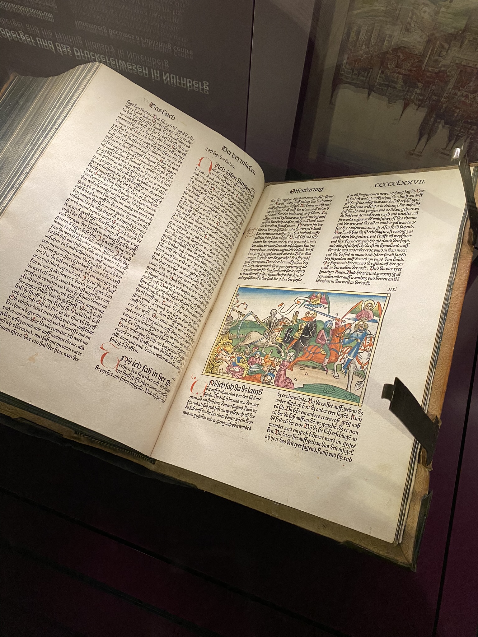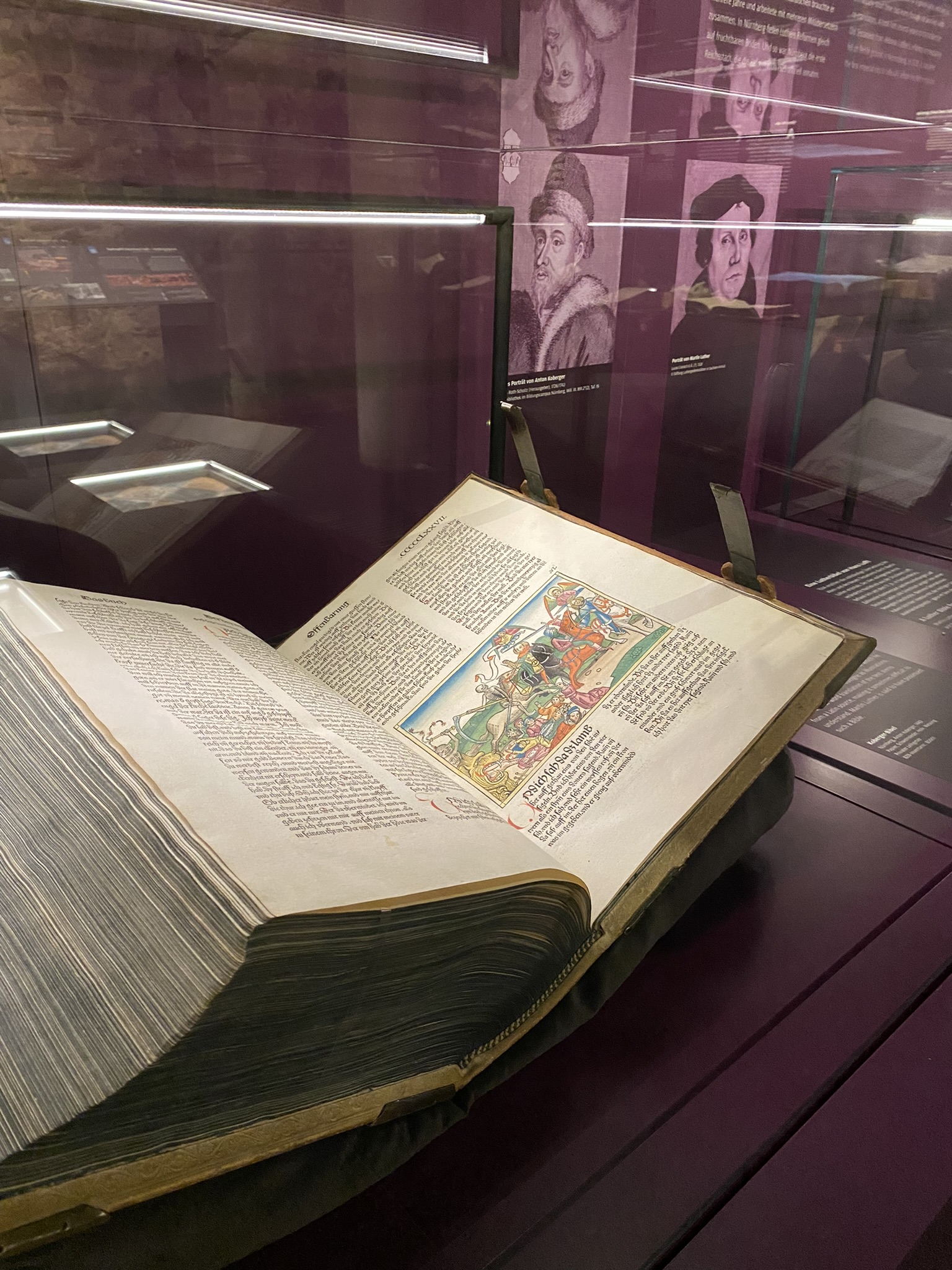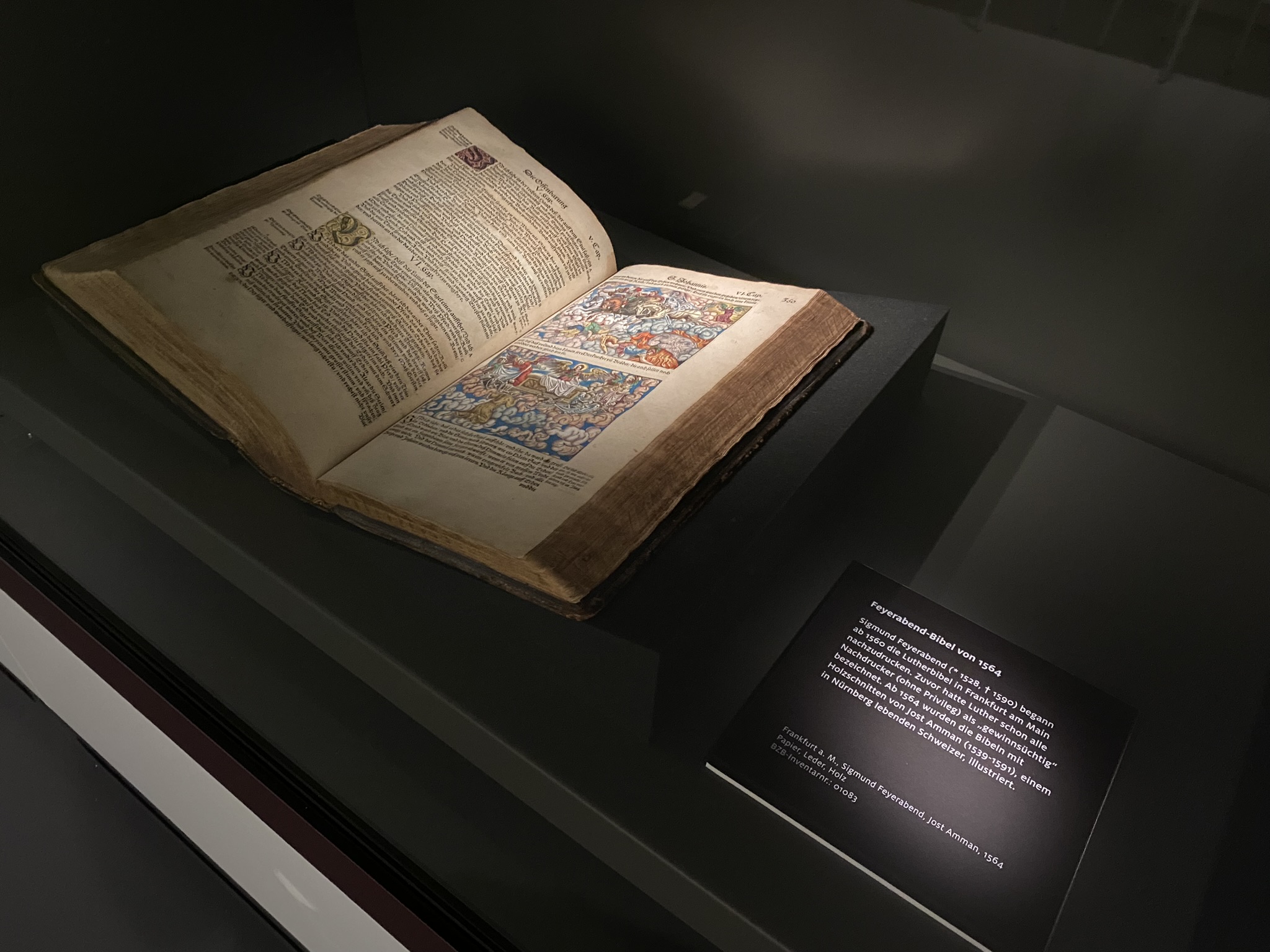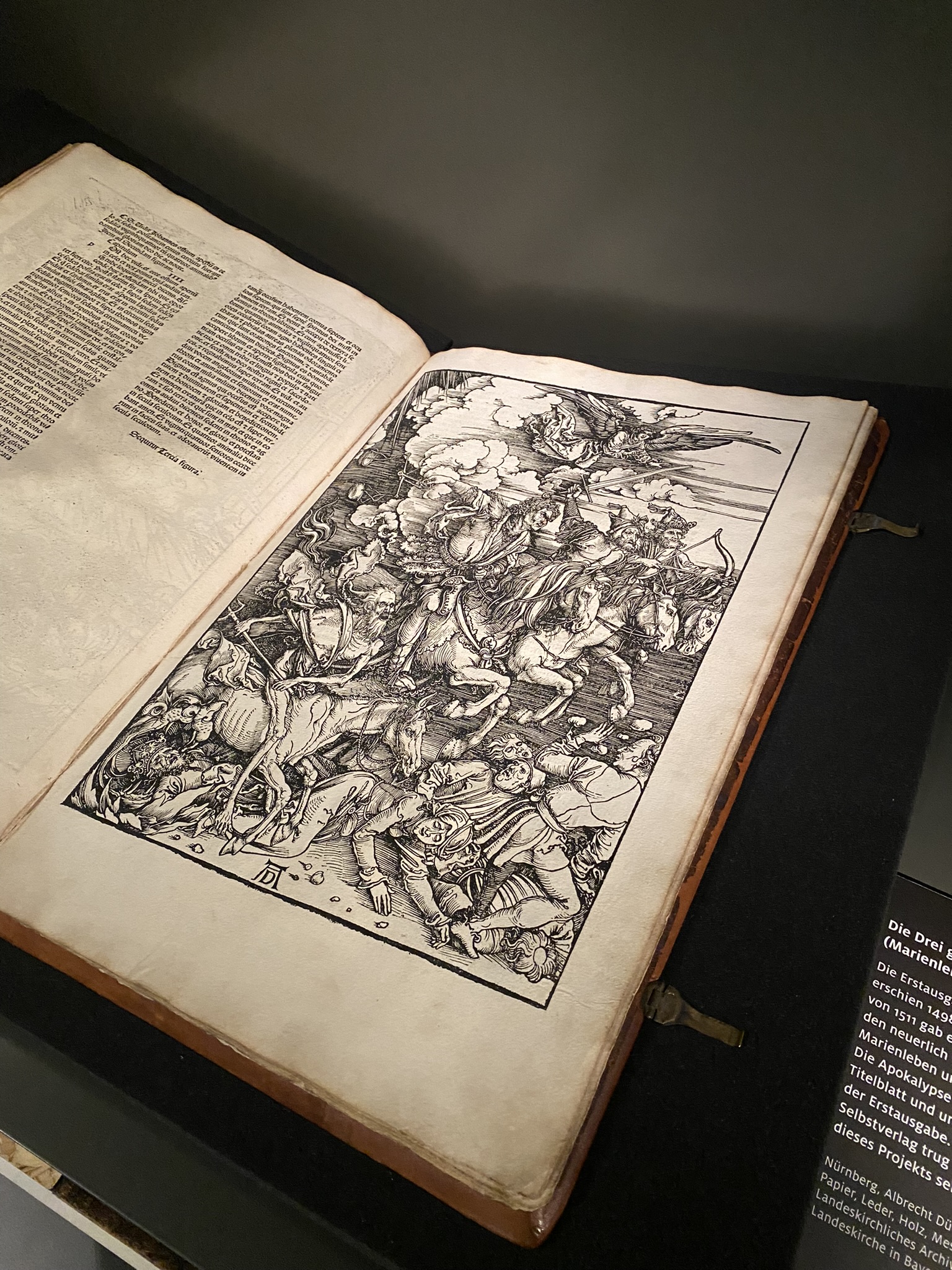 Am Anfang der Ausstellung steht chronologisch die Koberger-Bibel, die von Dürers Patenonkel Anton Koberger verlegt wurde. Die Darstellungen darin sah er bereits als Teenager und gelten in der Forschung als wichtige Inspirationsquelle für sein späteres Schaffen. Der ausgestellte Druck ist in einem Band mit seinen wichtigsten Holzschnitten enthalten und übrigens das einzige Werk dieser Art, das bis zum Künstler selbst zurück verfolgbar ist und den er möglicherweise selbst in Händen hielt. Dürer selbst hatte diesen im Selbstverlag herausgegeben und 1513 an Georg Beheim, den Propst von St. Lorenz, verschenkt. Das Landeskirchliche Archiv ermöglicht es uns, diesen originalen Dürer-Druck auszustellen.