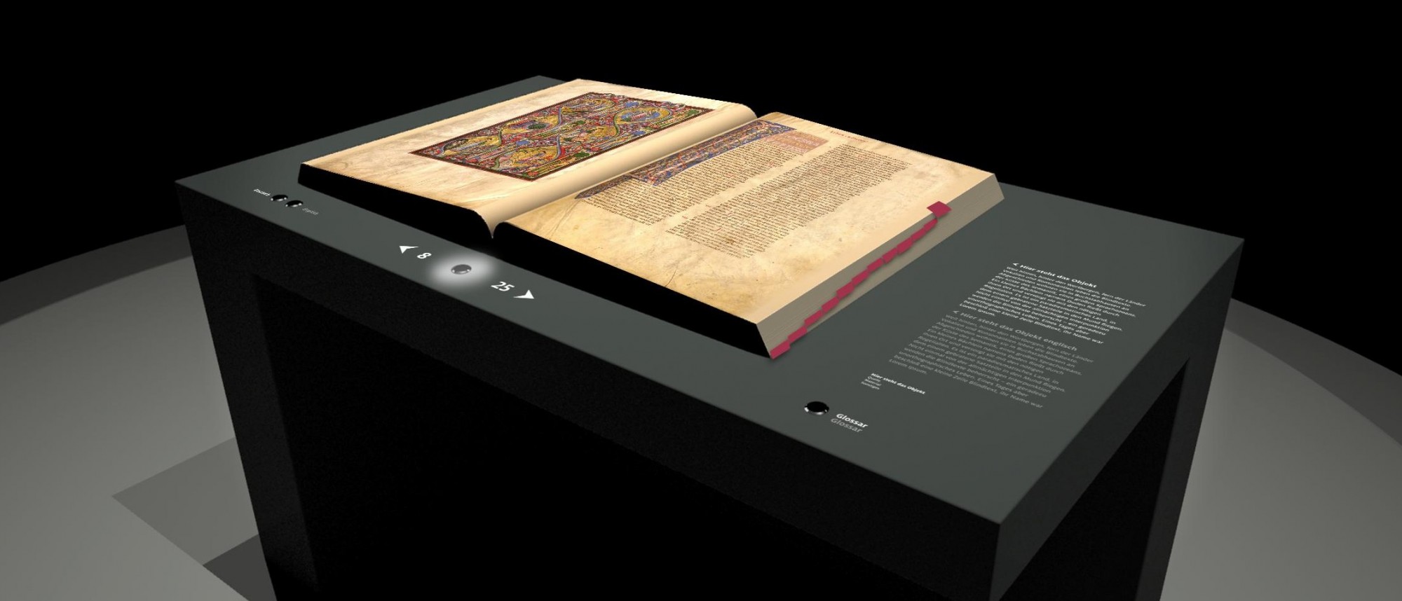 Thanks to this high-resolution copy of the Gumbertus Bible, it is now possible to project virtual images of the giant codex onto a blank book of the same format. This literally enables visitors to ‘leaf through’ the entire Gumbertus Bible page by page, from beginning to end. Additional background information can also be displayed alongside the text if desired.